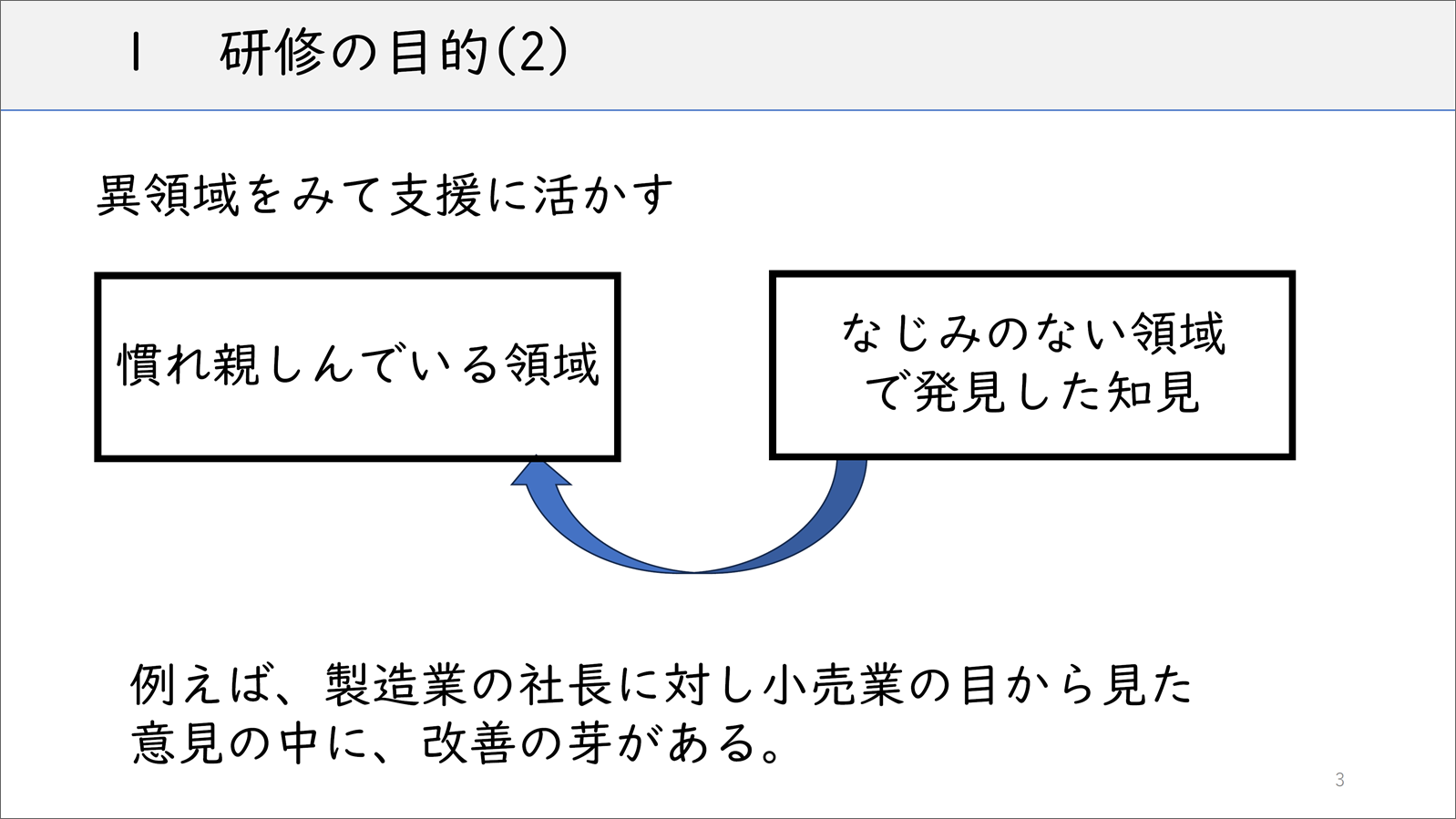 マクロの経営環境や政策の方向性を学びながら、個々の項目について支援先や勤務先に関係する中小企業に「この情報がどう役立つ可能性があるか」を考えながらご受講頂ければと思います。