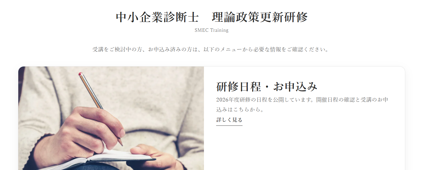 2026年度理論研修日程を公開しました。 2026.04.092026年度理論研修の日程を公開しました。 こちらからご覧頂くことが出来ます。2026年度の全日程を公開しています。全ての研修にお申込みが可能です。 今年度の研修受講を予定している方は、ぜひご覧ください。